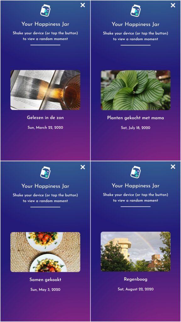 Which brings me to the first category of this lockdown list: STAY CHEERY. Those lovely winter and early spring days immediately made it to my daily list of happy moments. Since the end of 2019 I take the time to actually make that list every day using the app Happyfeed. I pick three moments, big or small, that brought me joy and made my day just a little brighter. It’s become a ritual which makes sure I don’t take those moments for granted. Every now and then I shake my digital happiness jar to view a random memory which always makes me smile. Here are four of them, right now I collected over one thousand. They’re in Dutch, but since I added photos, you get the gist 😉